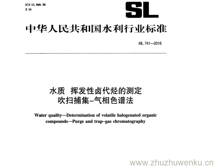 SL 741-2016 pdf下载 水质挥发性卤代烃的测定 吹扫捕集-气相色谱法。Water quality-Determination of volatile halogenated organic compounds-Purge and trap-gas chromatography.