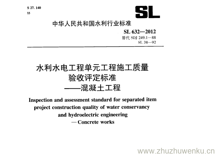 SL 632-2012 pdf下载 水利水电工程单元工程施工质量 验收评定标准 –混凝土工程。Inspection and assessment standard for separated item project construction quality of water conservancy and hydroelectric engineering -Concrete works.