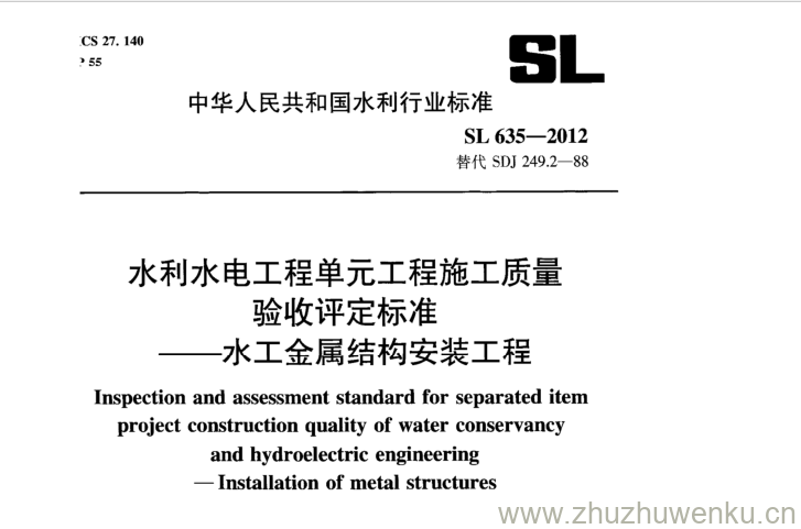 SL 635-2012 pdf下载 水利水电工程单元工程施工质量 验收评定标准 -水工金属结构安装工程。Inspection and assessment standard for separated item project construction quality of water conservancy and hydroelectric engineering -Installation of metal structures.