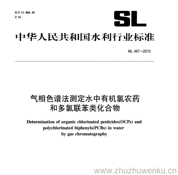 SL 497-2010 pdf下载 气相色谱法测定水中有机氯农药 和多氯联苯类化合物。Determination of organic chlorinated pesticides(OCPs)and polychlorinated biphenyls(PCBs) in water by gas chromatography.