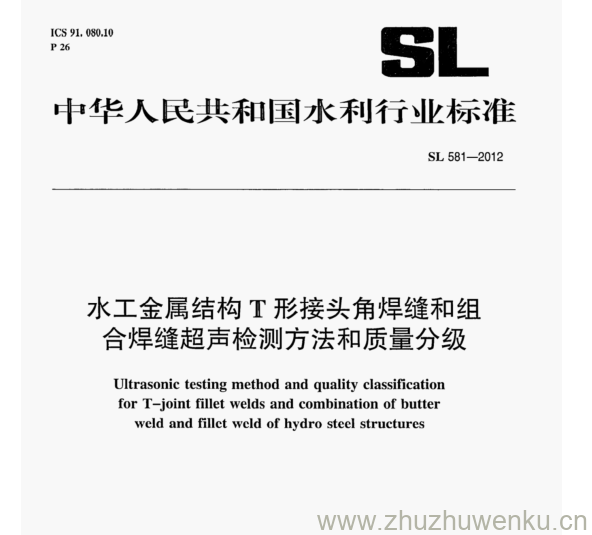 SL 581-2012 pdf下载 水工金属结构T形接头角焊缝和组 合焊缝超声检测方法和质量分级。Ultrasonic testing method and quality classification for T-joint fillet welds and combination of butter weld and fillet weld of hydro steel structures.
