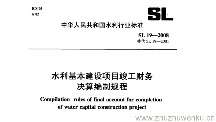SL 19-2008 pdf下载 水利基本建设项目竣工财务 决算编制规程。Compilation rules of final account for completion of water capital construction project.