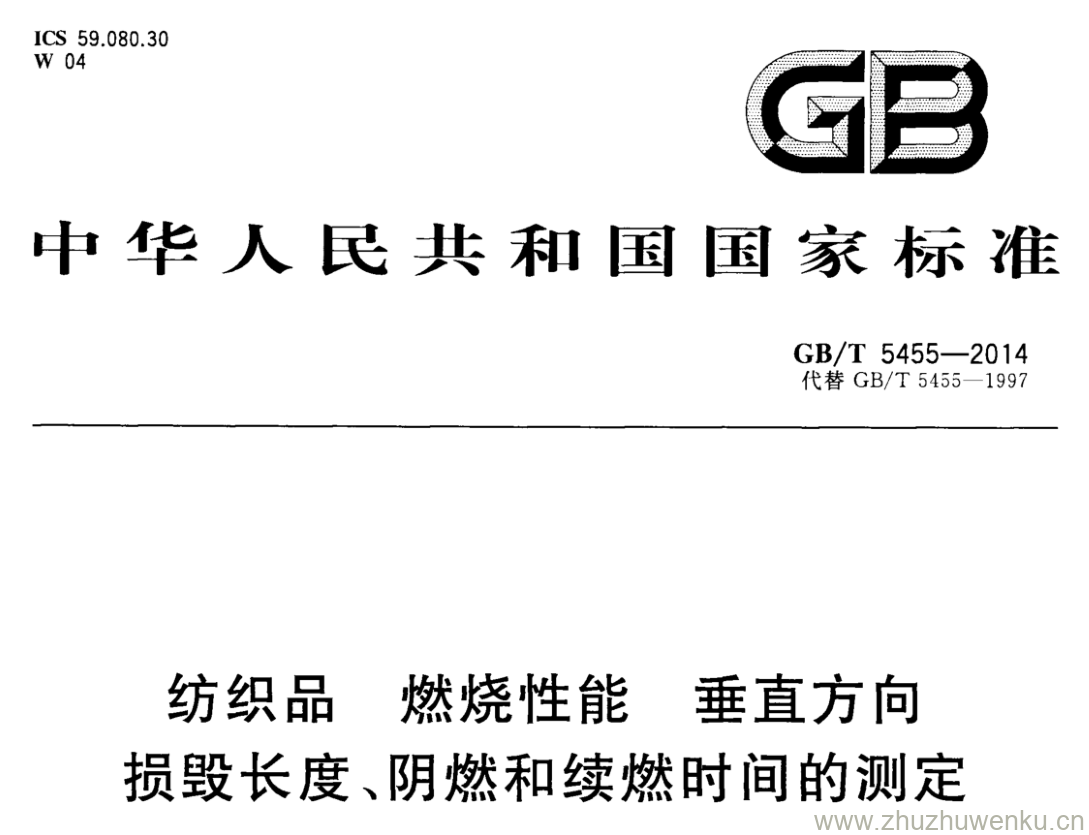 GB/T 5455-2014 pdf下载 纺织品 燃烧性能 垂直方向 损毁长度、阴燃和续燃时间的测定