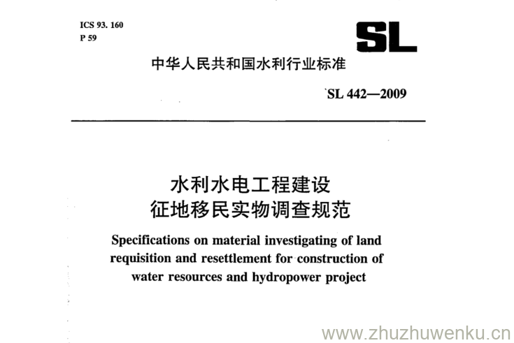 SL 442-2009 pdf下载 水利水电工程建设 征地移民实物调查规范。Specifications on material investigating of land requisition and resettlement for construction of water resources and hydropower project.