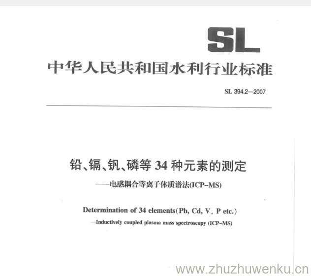 SL 394.2-2007 pdf下载 铅、镉、钒、磷等34种元素的测定 –电感耦合等离子体质谱法(ICP-MS)。Determination of 34 elements(Pb.Cd V.P etc.) -Inductively coupled plasma mass spectroscopy(ICP-MS).