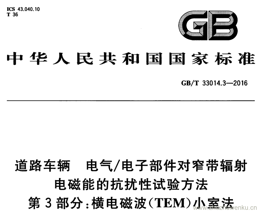 GB/T 33014.3-2016 pdf下载 道路车辆 电气/电子部件对窄带辐射 电磁能的抗扰性试验方法 第3部分:横电磁波(TEM)小室法