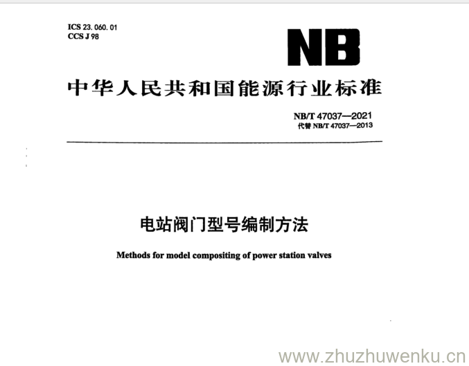 NB/T 47037-2021 pdf下载 电站阀门型号编制方法。Methods for model compositing of power station valves.