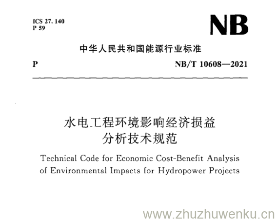 NB/T 10608-2021 pdf下载 水电工程环境影响经济损益 分析技术规范。Technical Code for Economic Cost-Benefit Analysis of Environmental Impacts for Hydropower Projects.