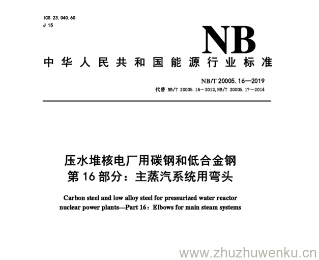 NB/T 20005.16-2019 pdf下载 压水堆核电厂用碳钢和低合金钢 第16部分:主蒸汽系统用弯头。Carbon steel and low alloy steel for pressurized water reactor nuclear power plants-Part 16: Elbows for main steam systems.