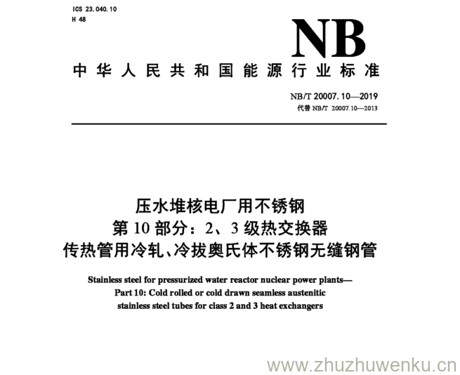 NB/T 20007.10-2019 pdf下载 压水堆核电厂用不锈钢 第10部分:2、3级热交换器 传热管用冷轧、冷拔奥氏体不锈钢无缝钢管。Stainless steel for pressurized water reactor nuclear power plants- Part 10: Cold rolled or cold drawn seamless austenitic stainless steel tubes for class 2 and 3 heat exchangers.
