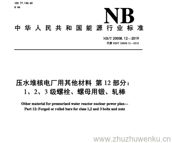 NB/T 20008.12-2019 pdf下载 压水堆核电厂用其他材料第12部分: 1、2、3 级螺栓、螺母用锻、轧棒。Other material for pressurized water reactor nuclear power plan- Part 12: Forged or rolled bars for class 1,2 and 3 bolts and nuts.
