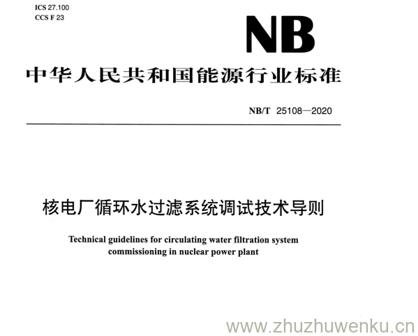 NB/T 25108-2020 pdf下载 核电厂循环水过滤系统调试技术导则。Technical guidelines for circulating water filtration system commissioning in nuclear power plant.