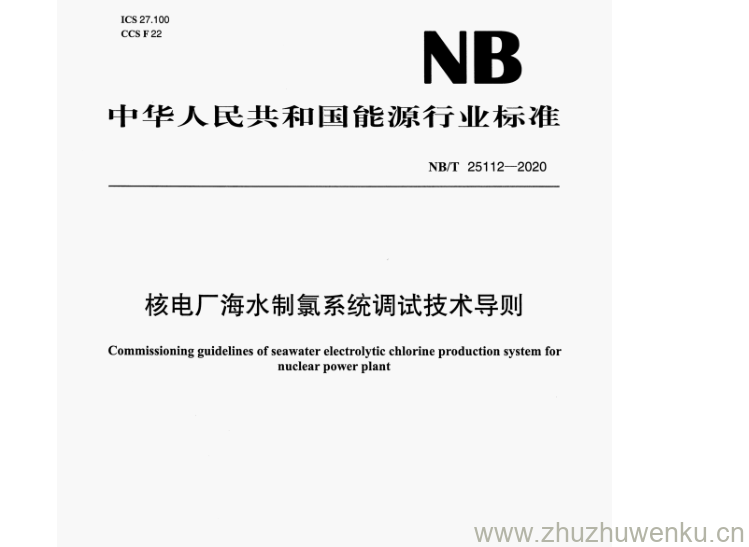 NB/T 25112-2020 pdf下载 核电厂海水制氯系统调试技术导则。Commissioning guidelines of seawater electrolytic chlorine production system for nuclear power plant.