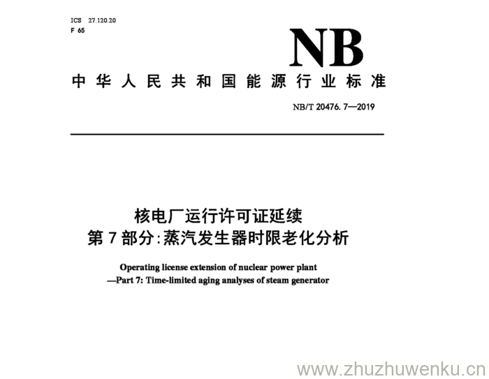 NB/T 20476.7-2019 pdf下载 核电厂运行许可证延续 第7部分:蒸汽发生器时限老化分析。Operating license extension of nuclear power plant -Part 7: Time-limited aging analyses of steam generator.