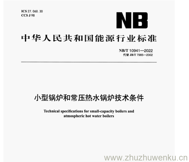 NB/T 10941-2022 pdf下载 小型锅炉和常压热水锅炉技术条件。Technical specifications for small-capacity boilers and atmospheric hot water boilers.