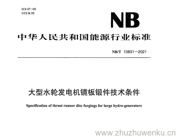 NB/T 10831-2021 pdf下载 大型水轮发电机镜板锻件技术条件。Specification of thrust runner dise forgings for large hydro-generators.