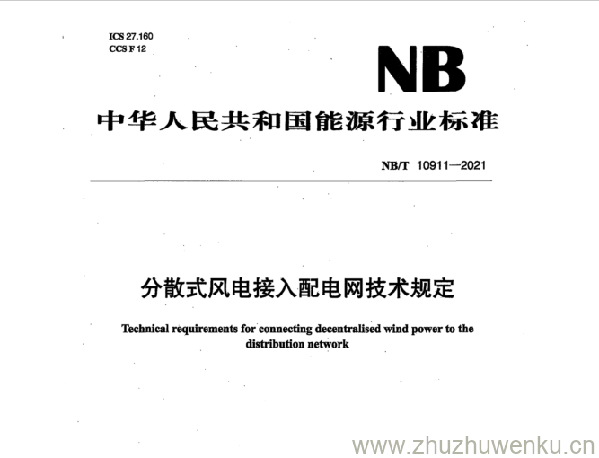 NB/T 10911-2021 pdf下载 分散式风电接入配电网技术规定。Technical requirements for connecting decentralised wind power to the distributionnetwork.