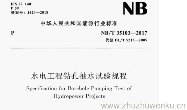 NB/T 35103-2017 pdf下载 水电工程钻孔抽水试验规程。Specification for Borehole Pumping Test of HydropowerProjects.