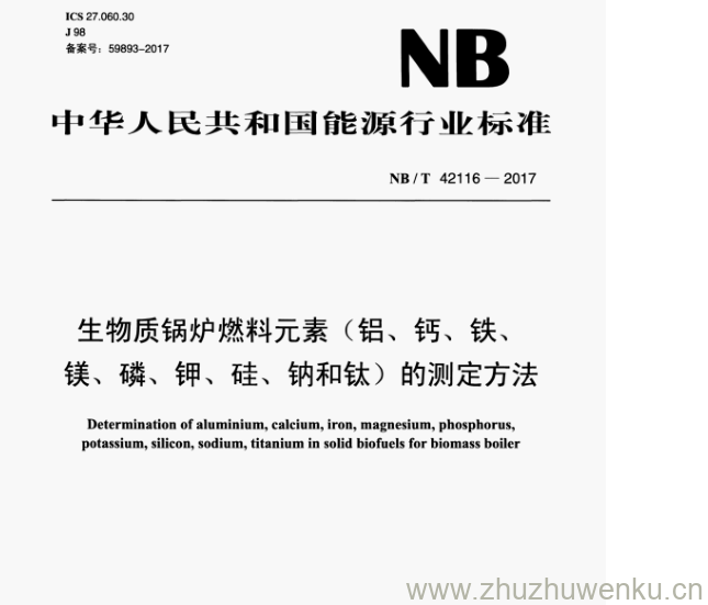 NB/T 42116-2017 pdf下载 生物质锅炉燃料元素(铝、钙、铁、 镁、磷、钾、硅、钠和钛)的测定方法。Determination of aluminiumcalcium,iron,magnesium, phosphorus, potassium silicon sodiumtitaniuminsolidbiofuelsforbiomassboiler.