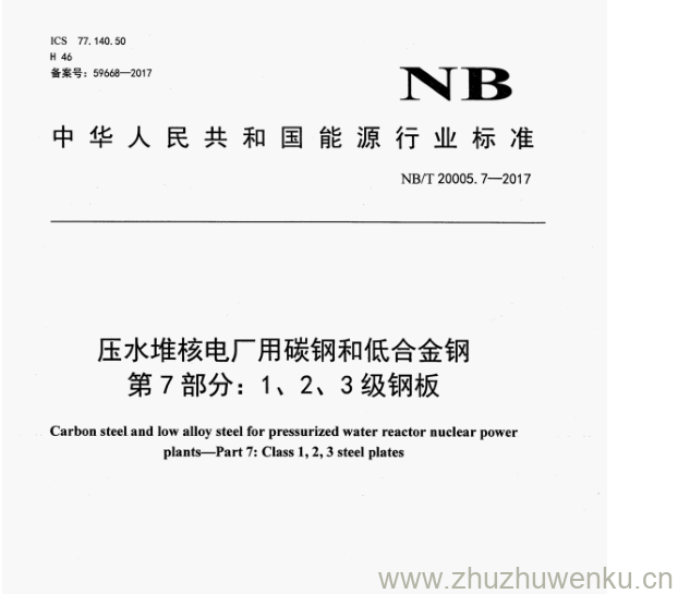NB/T 20005.7-2017 pdf下载 压水堆核电厂用碳钢和低合金钢 第7部分:1、2、3级钢板。Carbon steel and low alloy steel for pressurized water reactor nuclear power plantsPart7:Class1, 2, 3 steelplates.
