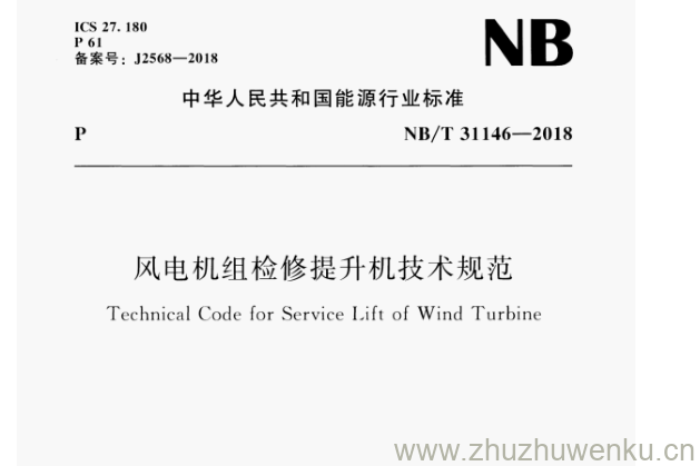 NB/T 31146-2018 pdf下载 风电机组检修提升机技术规范。TechnicalCodeforServiceLiftofWindTurbine.