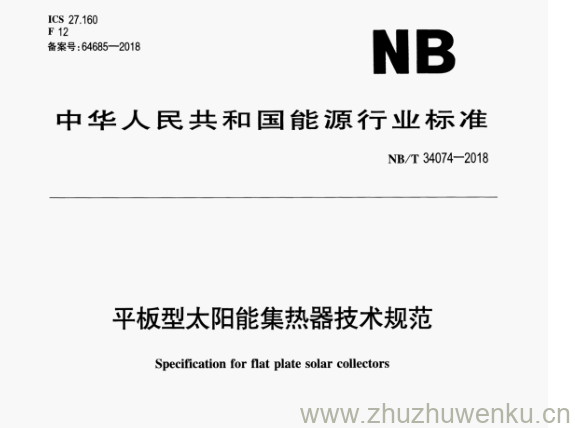 NB/T 34074-2018 pdf下载 平板型太阳能集热器技术规范。Specification for flat plate solar collectors。