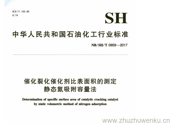 NB/SH/T 0959-2017 pdf下载 催化裂化催化剂比表面积的测定 静态氮吸附容量法。Determination of specific surface area of catalytic cracking catalyst by static volumetric method of nitrogen adsorption.