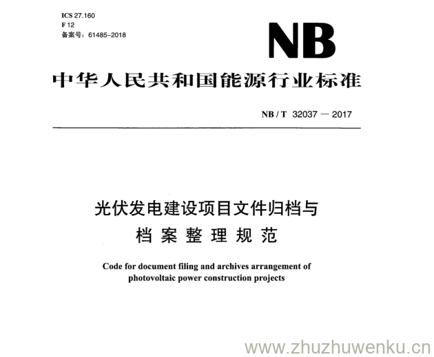 NB/T 32037-2017 pdf下载 光伏发电建设项目 文件归档与 档 案 整 理 规 范。Code for document filing and archives arrangement of photovoltaic power construction projects.