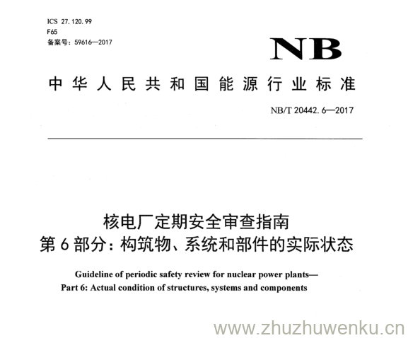 NB/T 20442.6-2017 pdf下载 核电厂定期安全审查指南 第 6 部分:构筑物、系统和部件的实际状态。Guideline of periodic safety review for nuclear power plants— Part 6: Actual condition of structures, systems and components.