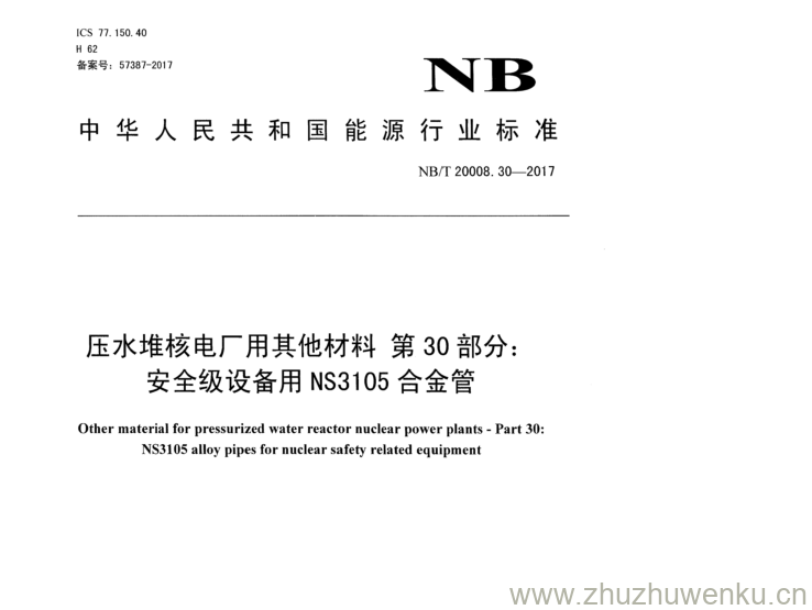 NB/T 20008.30-2017 pdf下载 压水堆核电厂用其他材料第3 0部分: 安全级设备用 NS 31 05合金管。Other material for pressurized water reactor nuclear power plants – Part 30: NS3105 alloy pipes for nuclear safety related equipment.