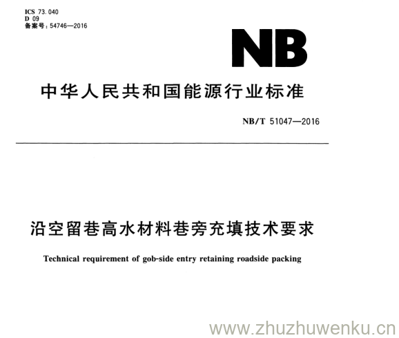 NB/T 51047-2016 pdf下载 沿空留巷高水材料巷旁充填技术要求。Technical requirement of gob-side entry retaining roadside packing.