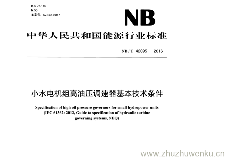 NB/T 42095-2016 pdf下载 小水电机组高油压调速器基本技术条件。Specification of high oil pressure governors for small hydropower units (IEC 61362: 2012, Guide to specification of hydraulic turbine governing systems , NEQ).