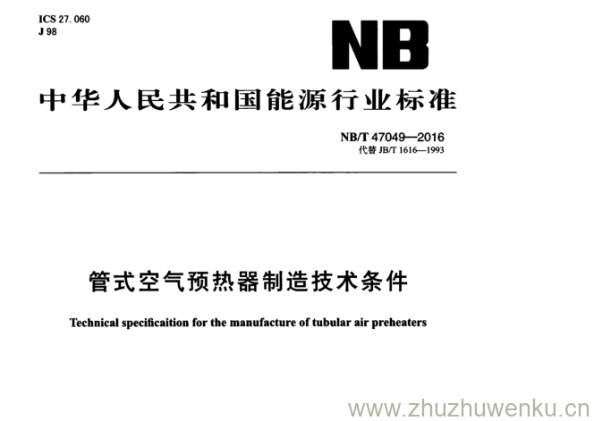 NB/T 47049-2016 pdf下载 管式空气预热器制造技术条件。Technical specificaition for the manufacture of tubular air preheaters.
