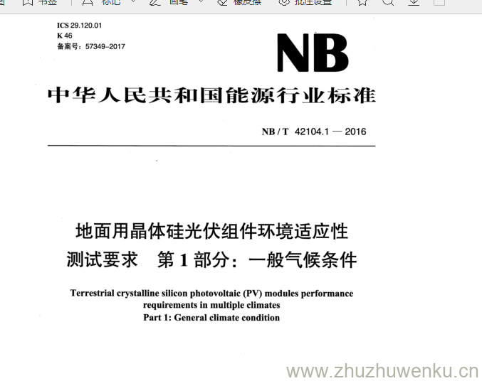 NB/T 42104.1-2016 pdf下载 地面用晶体硅光伏组件环境适应性 测 试 要 求 第 1 部分: 一般气候条件。Terrestrial crystalline sUicon photovoltaic (PV) modules performance requirements in multiple climates Part 1: General climate condition.
