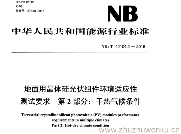 NB/T 42104.2-2016 pdf下载 地面用晶体硅光伏组件环境适应性 测 试 要 求 第 2 部分: 干热气候条件。Terrestrial crystalline silicon photovoltaic (PV) modules performance requirements in multiple climates Part 2: Hot-dry climate condition.