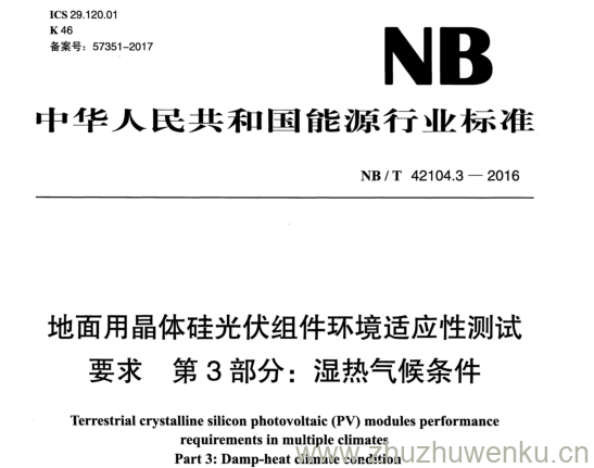 NB/T 42104.3-2016 pdf下载 地面用晶体硅光伏组件环境适应性测试 要 求 第 3 部分: 湿热气候条件。Terrestrial crystalline silicon photovoltaic (PV) modules performance requirements in multiple climates Part 3: Damp-heat climate condition.