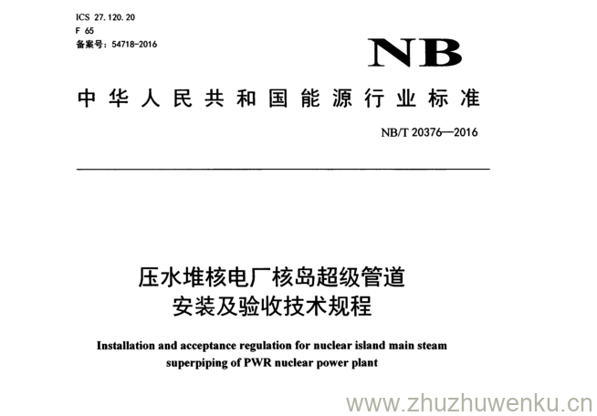 NB/T 20376-2016 pdf下载 压水堆核电厂核岛超级管道 安装及验收技术规程。Installation and acceptance regulation for nuclear island main steam superpiping of PWR nuclear power plant.