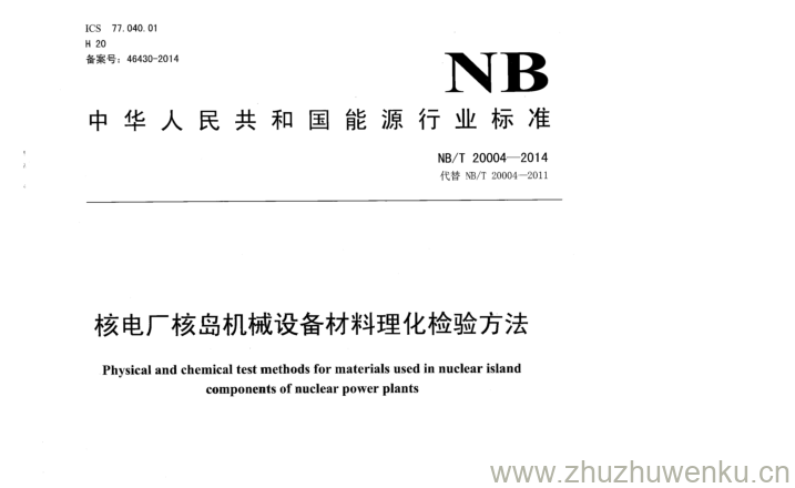 NB 20004-2014 pdf下载 核电厂核岛机械设备材料理化检验方法。Physical and chemical test methods for materials used in nuclear island components of nuclear power plants .