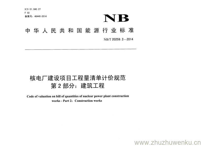 NB/T 20259.2-2014 pdf下载 核电厂建设项目工程量清单计价规范 第2部分:建筑工程。Code of valuation on bill of quantities of nuclear power plant construction works – Part 2: Construction works .