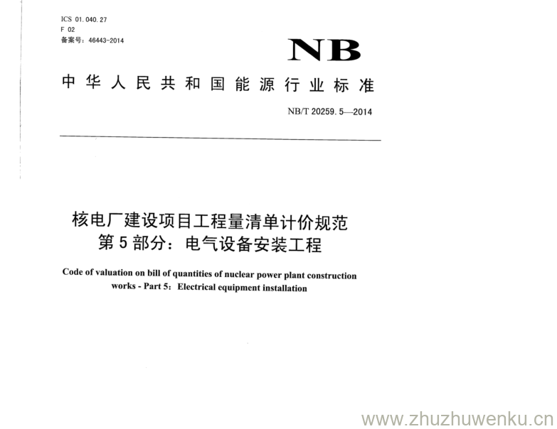 NB/T 20259.5-2014 pdf下载 核电厂建设项目工程量清单计价规范 第5部分:电气设备安装工程。Code of valuation on bill of quantities of nuclear power plant construction works- Part 5: Electrical equipment installation .