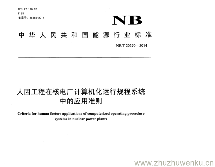 NB/T 20270-2014 pdf下载 人因工程在核电厂计算机化运行规程系统 中的应用准则。Criteria for human factors applications of computerized operating procedure systems in nuclear power plants .