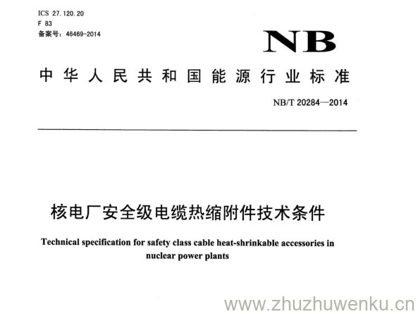 NB/T 20284-2014 pdf下载 核电厂安全级电缆热缩附件技术条件。 Technical specifcation for safety class cable heat-shrinkable accessories in nuclear power plants .