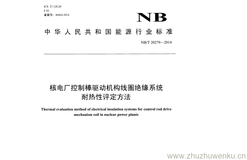NB/T 20279-2014 pdf下载 核电厂控制棒驱动机构线圈绝缘系统 耐热性评定方法。Thermal evaluation method of electrical insulation systems for control rod drive mechanism coil in nuclear power plants.
