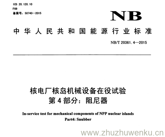 NB/T 20361.4-2015 pdf下载 核电厂核岛机械设备在役试验 第 4 部分: 阻尼器。In-service test for mechanical components of NPP nuclear islands Part4: Snubber.
