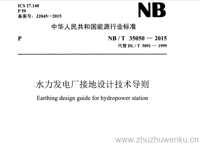 NB/T 35050-2015 pdf下载 水力发电厂接地设计技术导则。Earthing design guide for hydropower station.