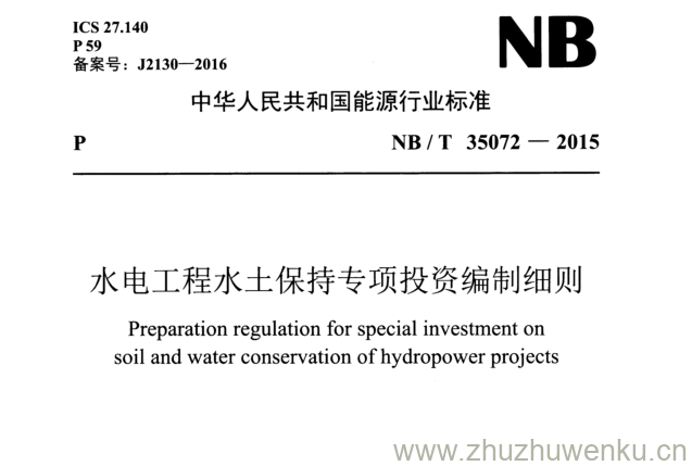 NB/T 35072-2015 pdf下载 水电工程水土保持专项投资编制细则。Preparation regulation for special investment on soil and water conservation of hydropower projects.