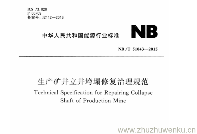 NB/T 51043-2015 pdf下载 生 产 矿 井 立 井 垮 塌 修 复 治 理 规 范 。Technical Specification for Repairing Collapse Shaft of Production Mine.