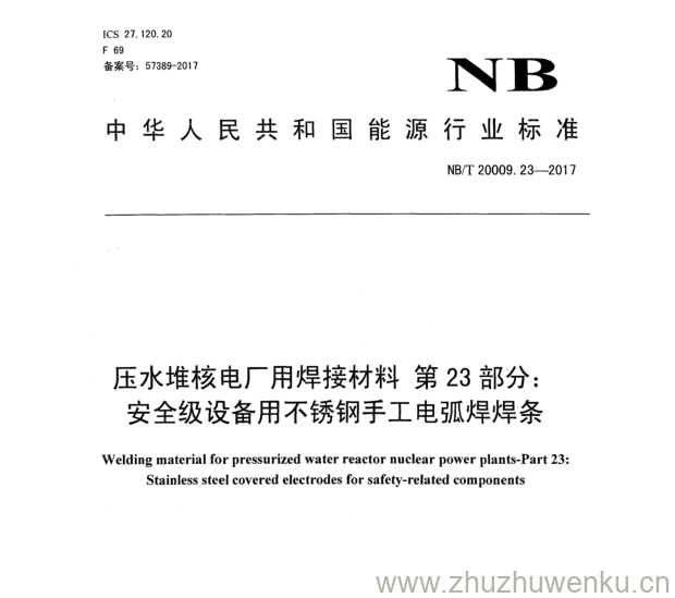 NB/T 20009.23-2017 pdf下载 压水堆核电厂用焊接材料第23 部分: 安全级设备用不锈钢手工电弧焊焊条。Welding material for pressurized water reactor nuclear power plants-Part 23: Stainless steel covered electrodes for safety-related components.