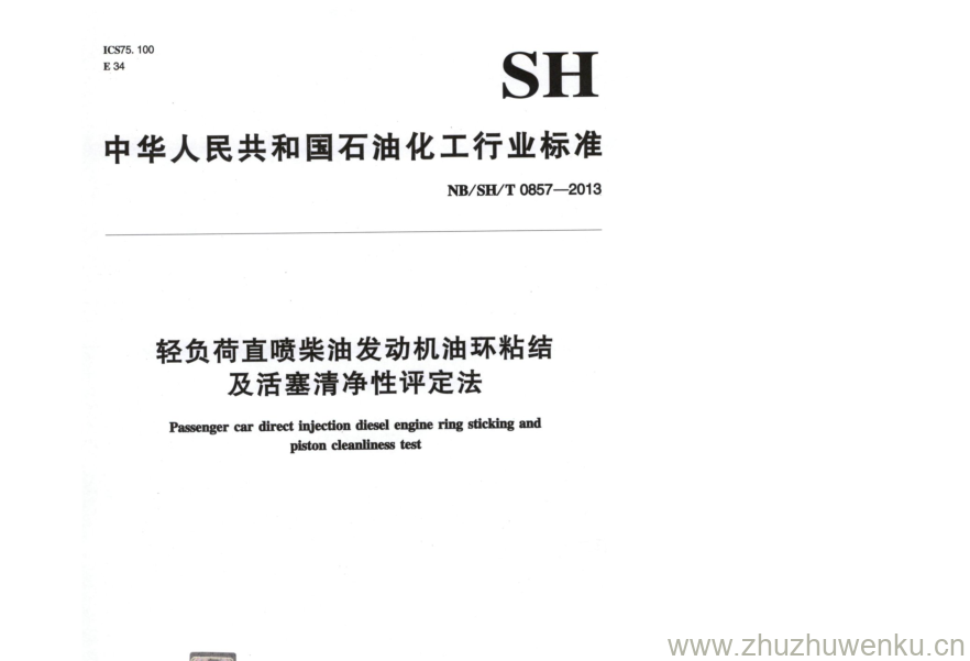 NB/SH/T 0857-2013 pdf下载 轻负荷直喷柴油发动机油环粘结 及活塞清净性评定法。Passenger car direct injection diesel engine ring sticking and piston cleanliness test.