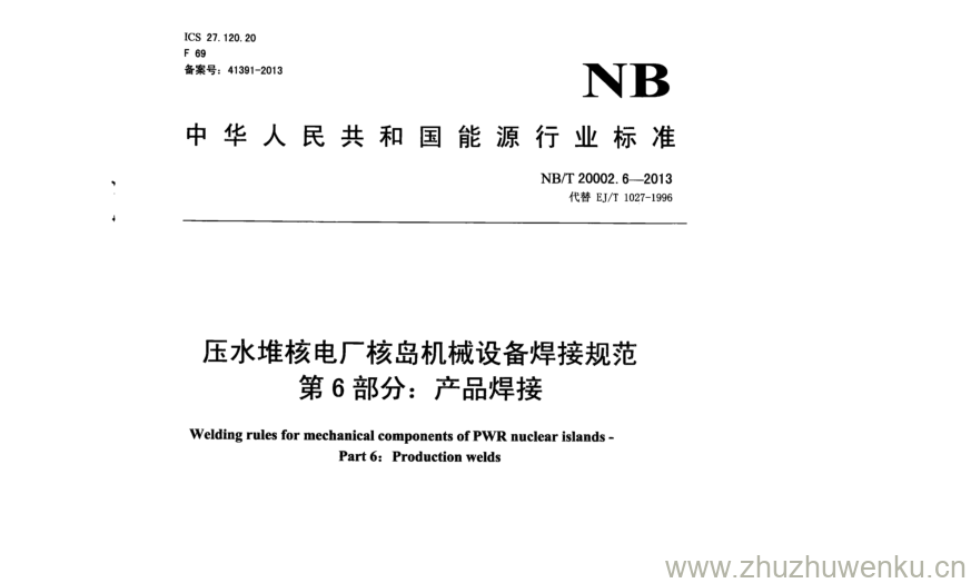 NB/T 20002.6-2013 pdf下载 压水堆核电厂核岛机械设备焊接规范 第6部分:产品焊接。Welding rules for mechanical components of PWR nuclear islands – Part 6: Production welds.